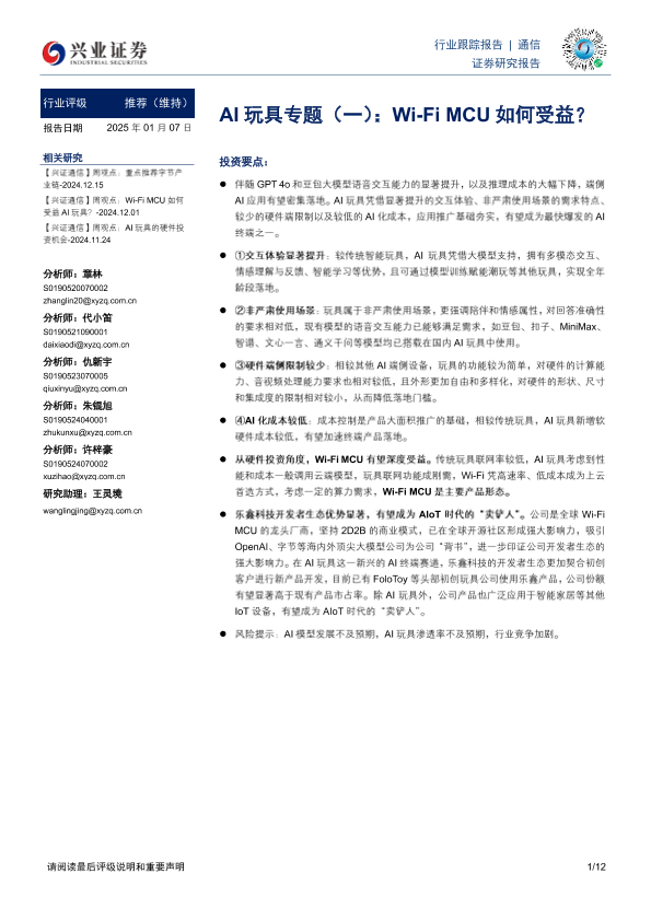 【兴业证券】【20250107】通信:AI玩具专题(一):Wi-Fi MCU如何受益?-12页