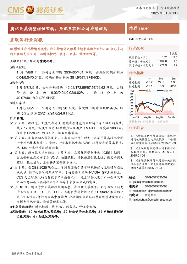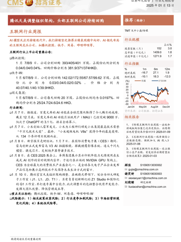 【海通证券】【20250113】20250113-招商证券-互联网行业周报:腾讯天美调整组织架构,头部互联网公司持续回购-10页