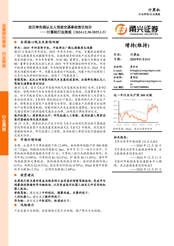 【甬兴证券】【20250124】计算机行业周报:武汉率先确认无人驾驶交通事故责任划分-10页