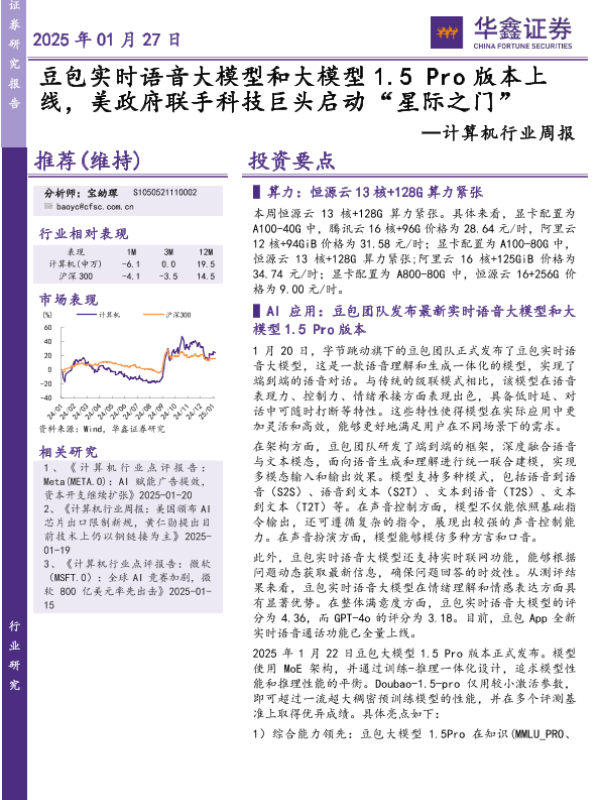 【华鑫证券】【20250127】计算机行业周报:豆包实时语音大模型和大模型1.5 Pro版本上线,美政府联手科技巨头启动“星际之门”-15页