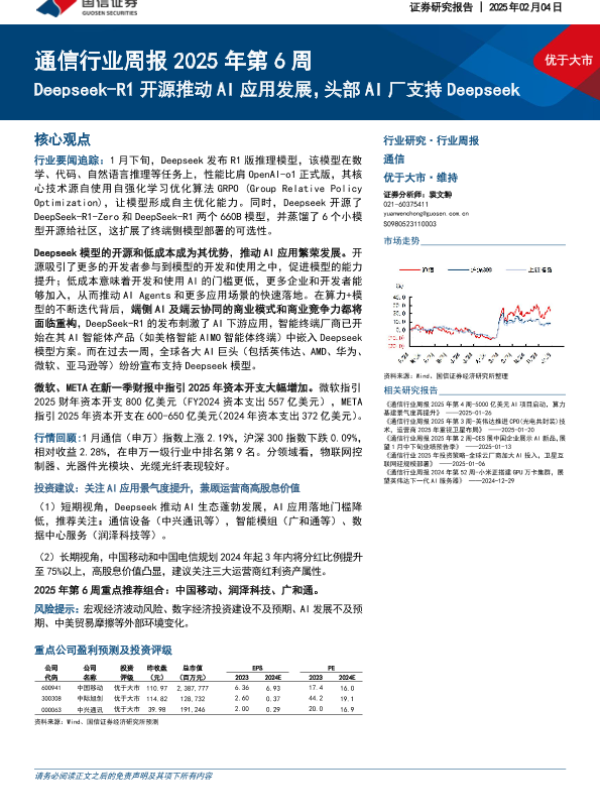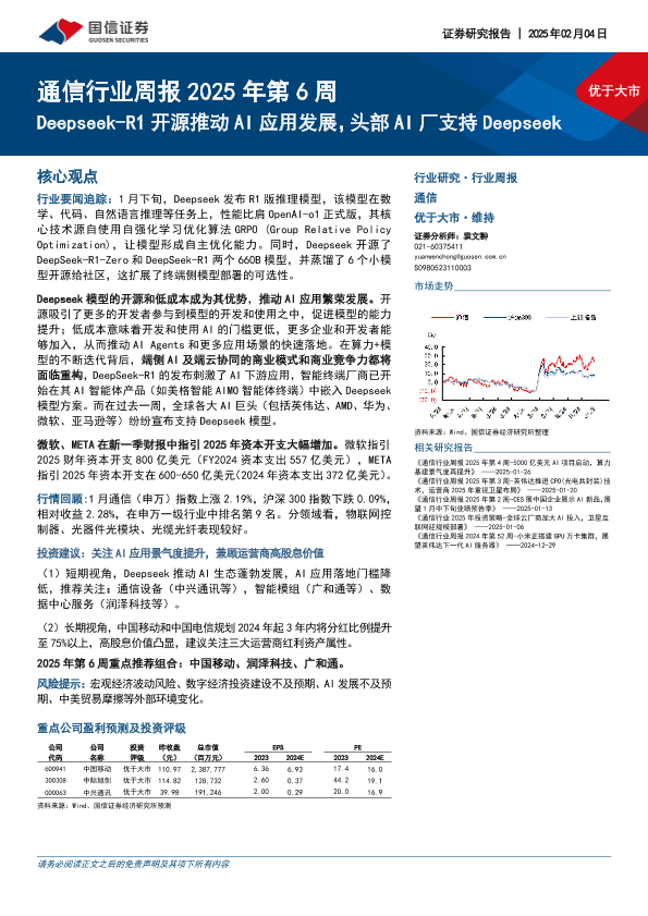 【国信证券】【20250204】通信行业周报2025年第6周:Deepseek-R1开源推动AI应用发展,头部AI厂支持Deepseek-22页