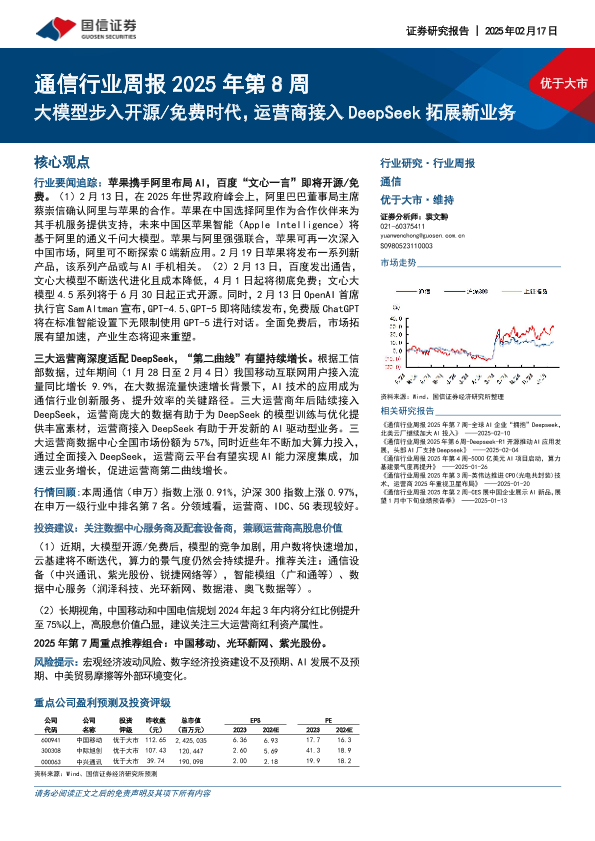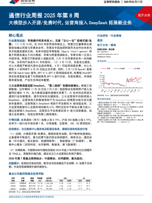 【国信证券】【20250217】通信行业周报2025年第8周:大模型步入开源免费时代,运营商接入DeepSeek拓展新业务-17页