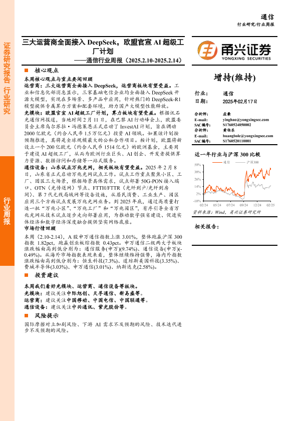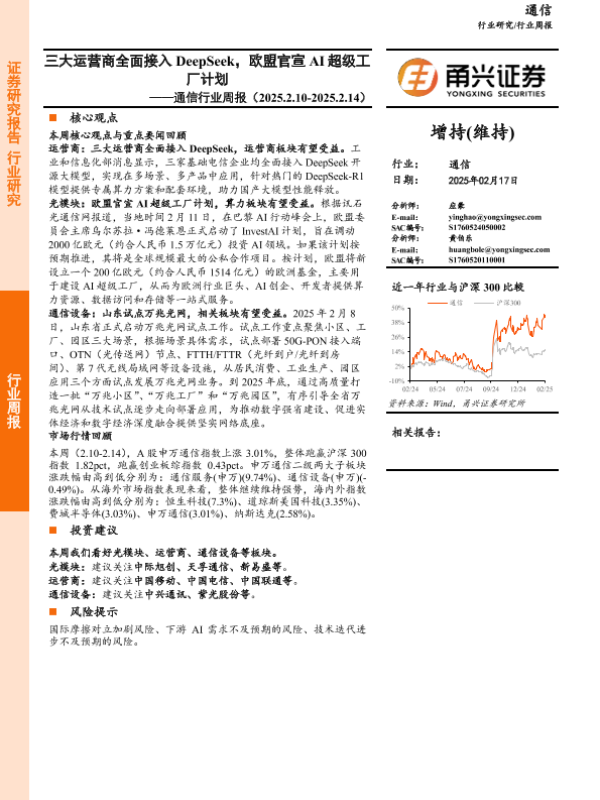 【甬兴证券】【20250217】通信行业周报:三大运营商全面接入DeepSeek,欧盟官宣AI超级工厂计划-12页