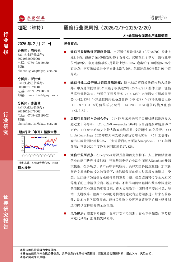 【东莞证券】【20250221】通信行业双周报:AI+通信融合加速全产业链受益-12页