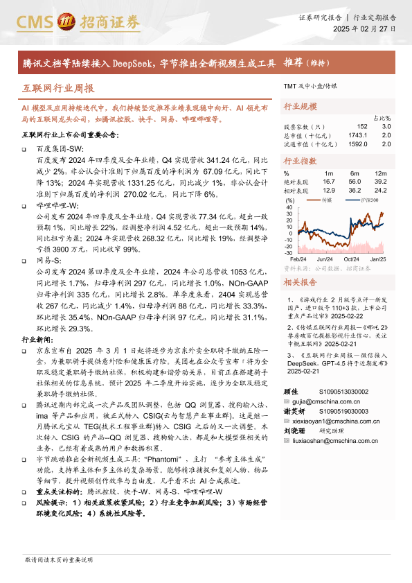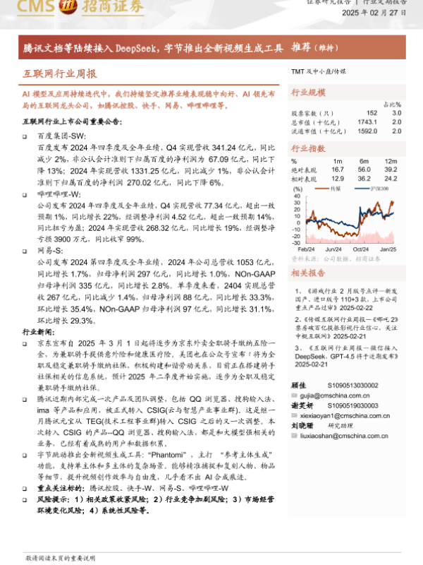 【海通证券】【20250227】互联网行业周报:腾讯文档等陆续接入DeepSeek,字节推出全新视频生成工具-11页