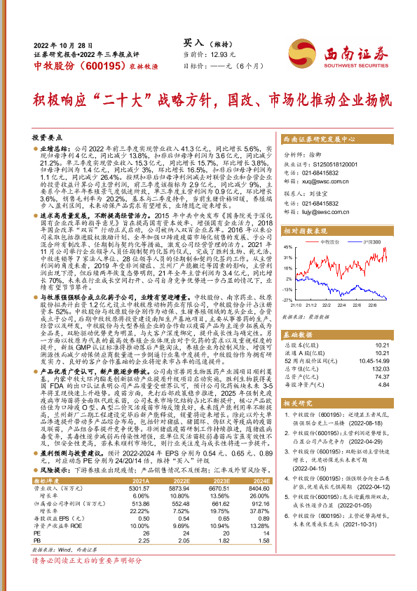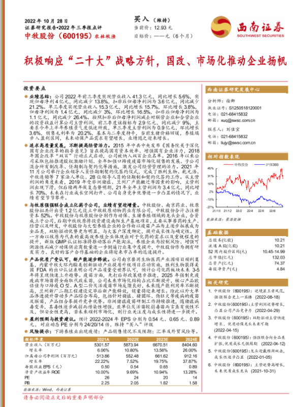 【西南证券】【20221028】中牧股份-600195-积极响应“二十大”战略方针,国改、市场化推动企业扬帆-23页