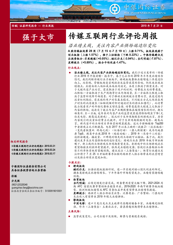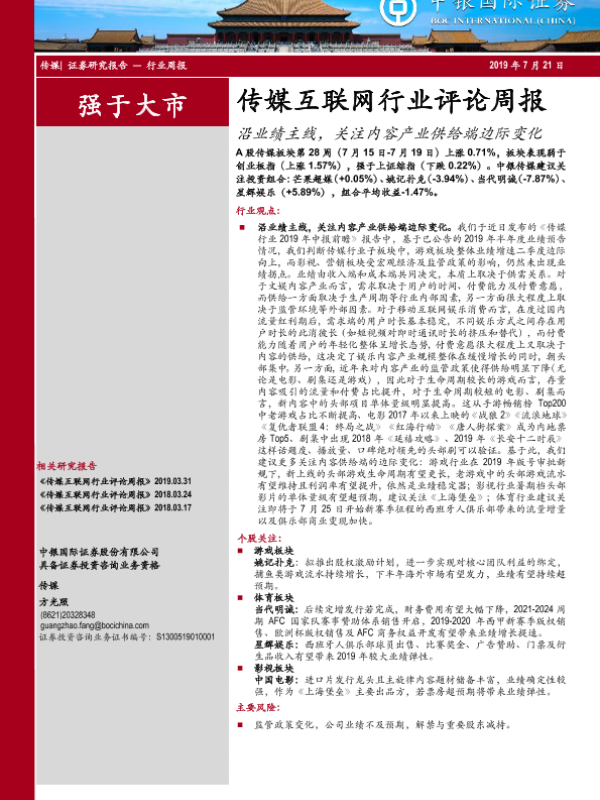【中银证券】【20190721】20190721-中银证券-传媒互联网行业评论周报:沿业绩主线,关注内容产业供给端边际变化-19页