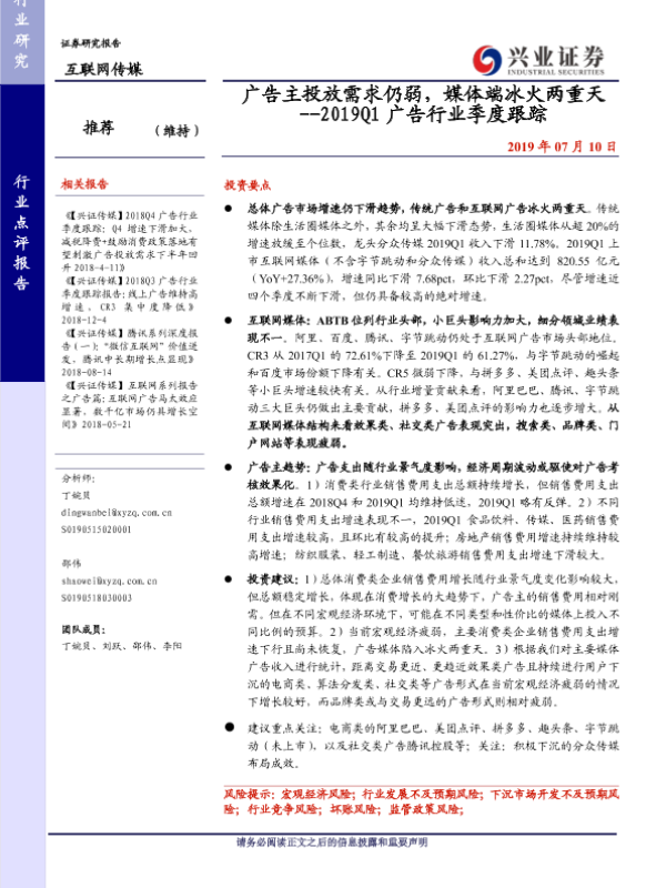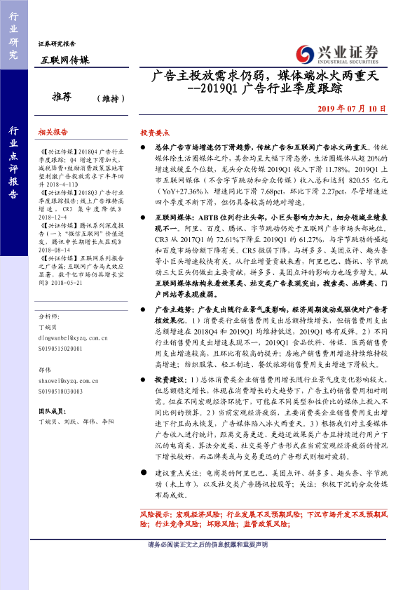 【兴业证券】【20190710】广告主投放需求仍弱,媒体端冰火两重天 --2019Q1广告行业季度跟踪-13页