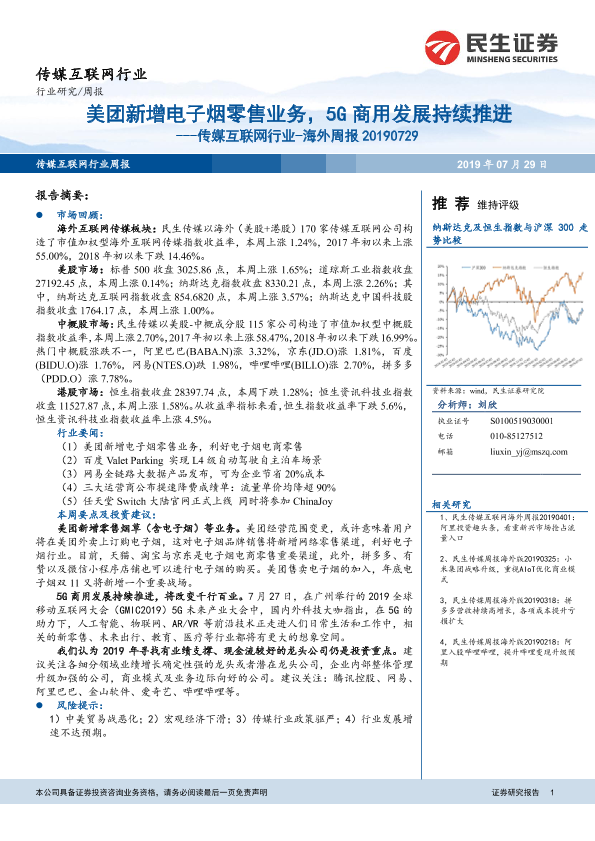 【民生证券】【20190729】20190729-民生证券-传媒互联网行业-海外周报:美团新增电子烟零售业务,5G商用发展持续推进-18页