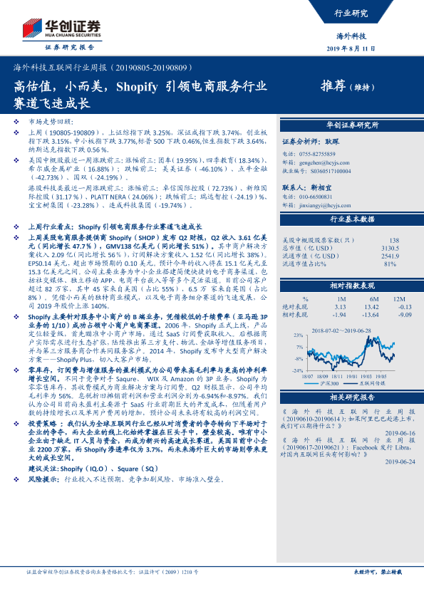 【华创证券】【20190811】海外科技互联网行业周报:高估值,小而美,Shopify引领电商服务行业赛道飞速成长-13页