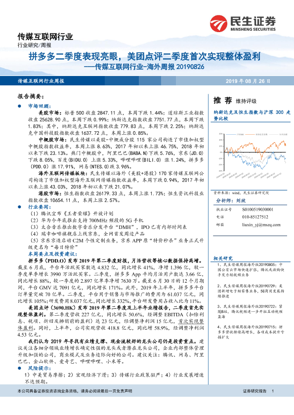 【民生证券】【20190826】20190826-民生证券-传媒互联网行业-海外周报:拼多多二季度表现亮眼,美团点评二季度首次实现整体盈利-15页