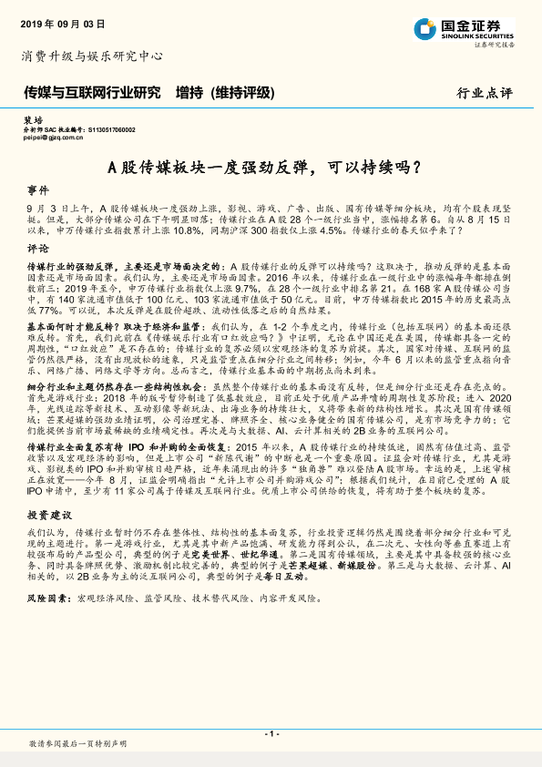 【国金证券】【20190903】A股传媒板块一度强劲反弹,可以持续吗?-5页