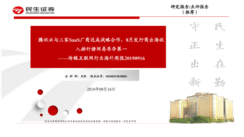 【民生证券】【20190916】腾讯云与三家SaaS厂商达成战略合作,8月发行商出海收入排行榜网易再夺第一-30页