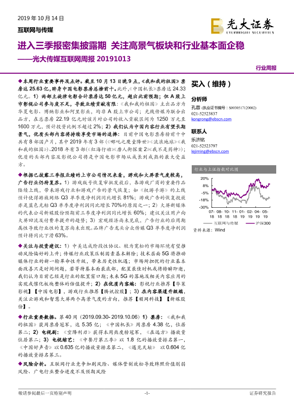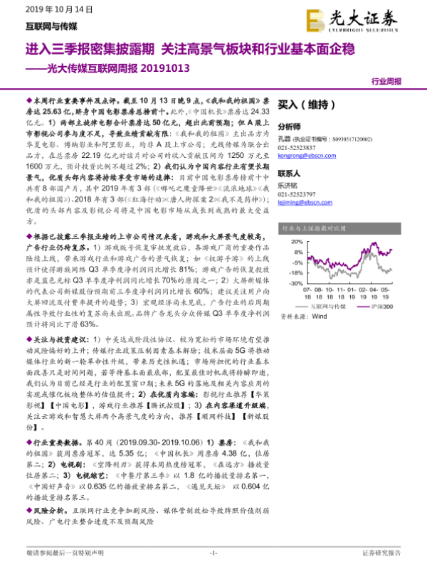 【光大证券】【20191014】20191014-光大证券-光大传媒互联网周报:进入三季报密集披露期 关注高景气板块和行业基本面企稳-23页