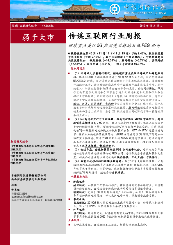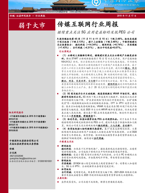 【中银证券】【20191117】20191117-中银证券-传媒互联网行业周报:继续重点关注5G应用受益标的及低PEG公司-20页