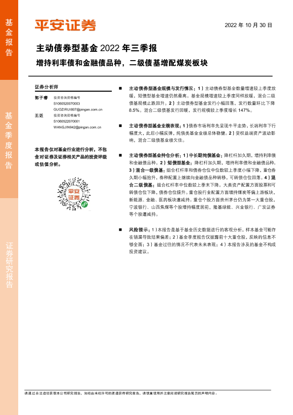 【平安证券】【20221030】主动债券型基金2022年三季报:增持利率债和金融债品种,二级债基增配煤炭板块-19页