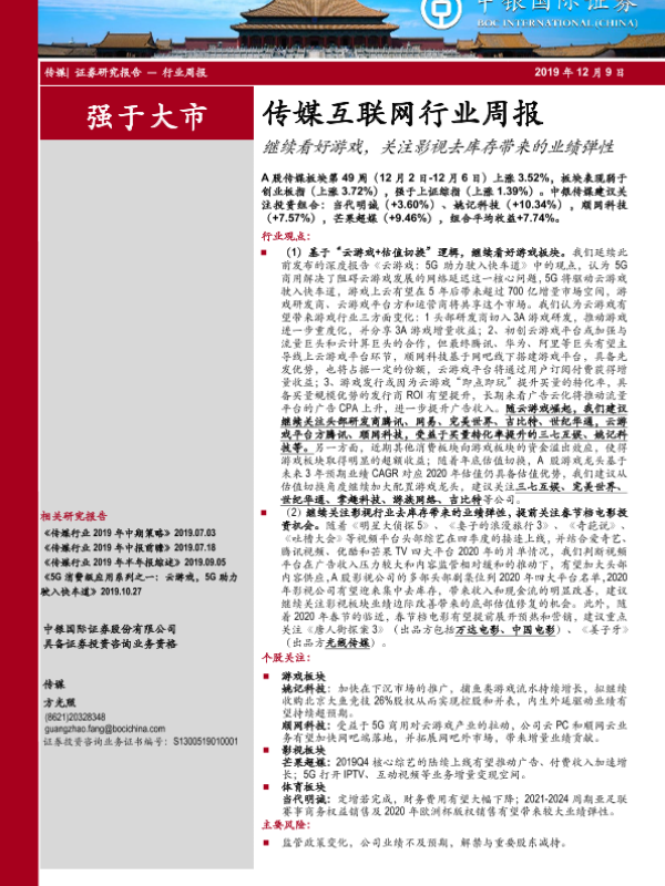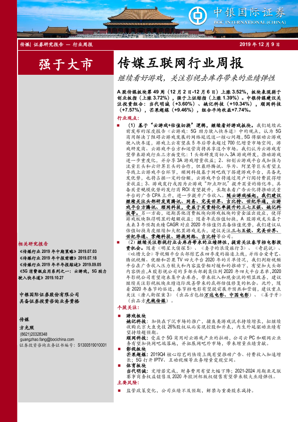 【中银证券】【20191209】20191209-中银证券-传媒互联网行业周报:继续看好游戏,关注影视去库存带来的业绩弹性-17页