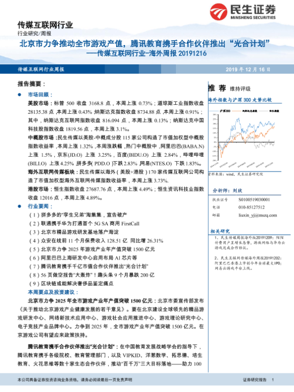 【民生证券】【20191216】20191216-民生证券-传媒互联网行业-海外周报:北京市力争推动全市游戏产值,腾讯教育携手合作伙伴推出“光合计划”-18页