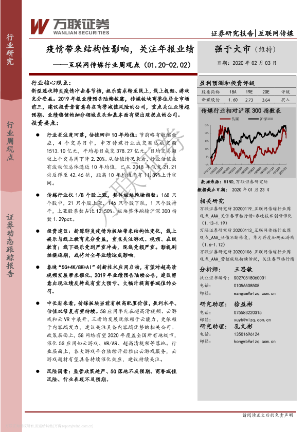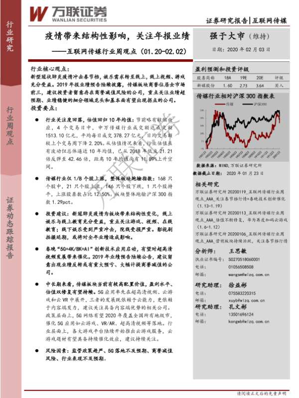 【万联证券】【20200203】互联网传媒行业周观点:疫情带来结构性影响,关注年报业绩-14页
