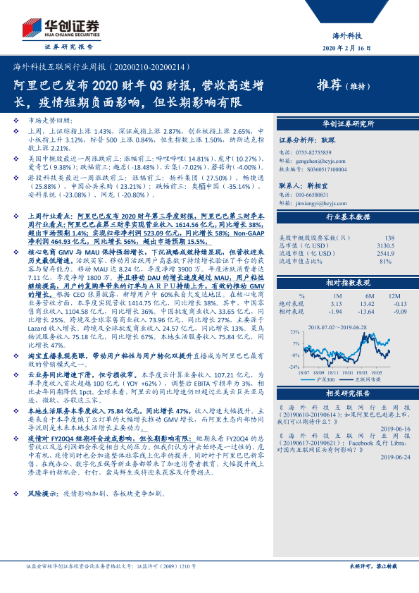 【华创证券】【20200216】海外科技互联网行业周报:阿里巴巴发布2020财年Q3财报,营收高速增长,疫情短期负面影响,但长期影响有限-23页