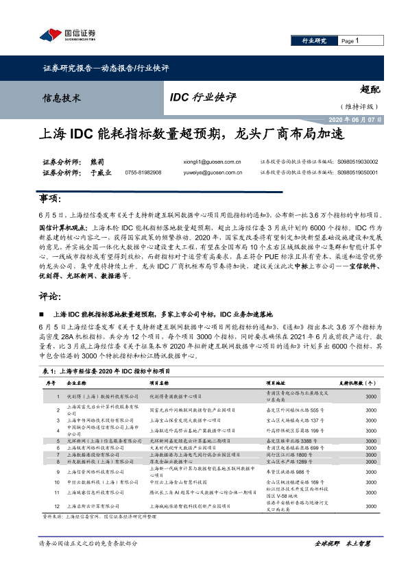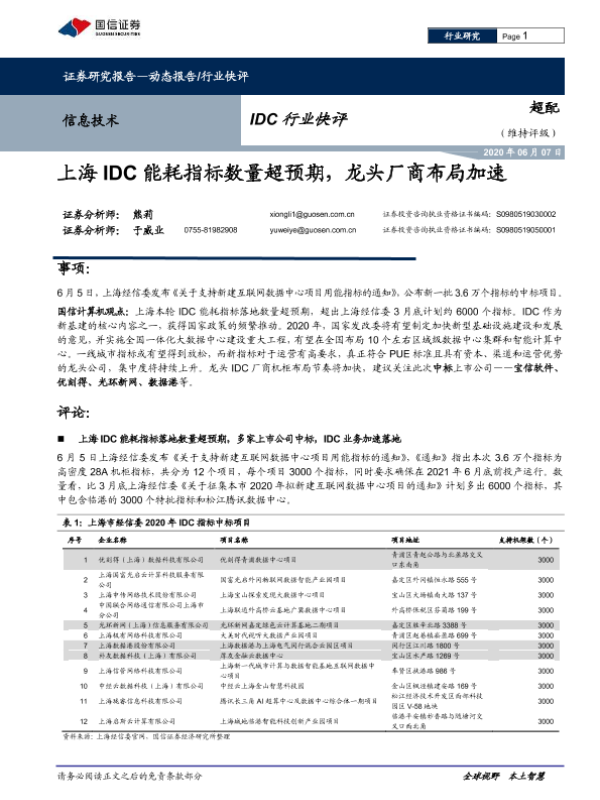 【国信证券】【20200607】信息技术IDC行业快评:上海IDC能耗指标数量超预期,龙头厂商布局加速-4页