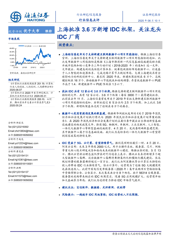 【海通证券】【20200610】信息服务行业信息点评:上海批准3.6万新增IDC机架,关注龙头IDC厂商-3页