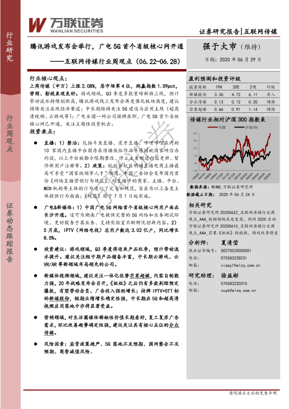 【万联证券】【20200629】20200629-万联证券-互联网传媒行业周观点:腾讯游戏发布会举行,广电5G首个省级核心网开通-13页