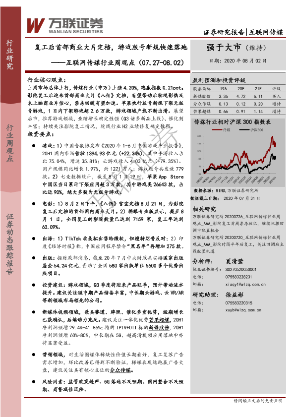 【万联证券】【20200802】互联网传媒行业周观点:复工后首部商业大片定档,游戏版号新规快速落地-13页