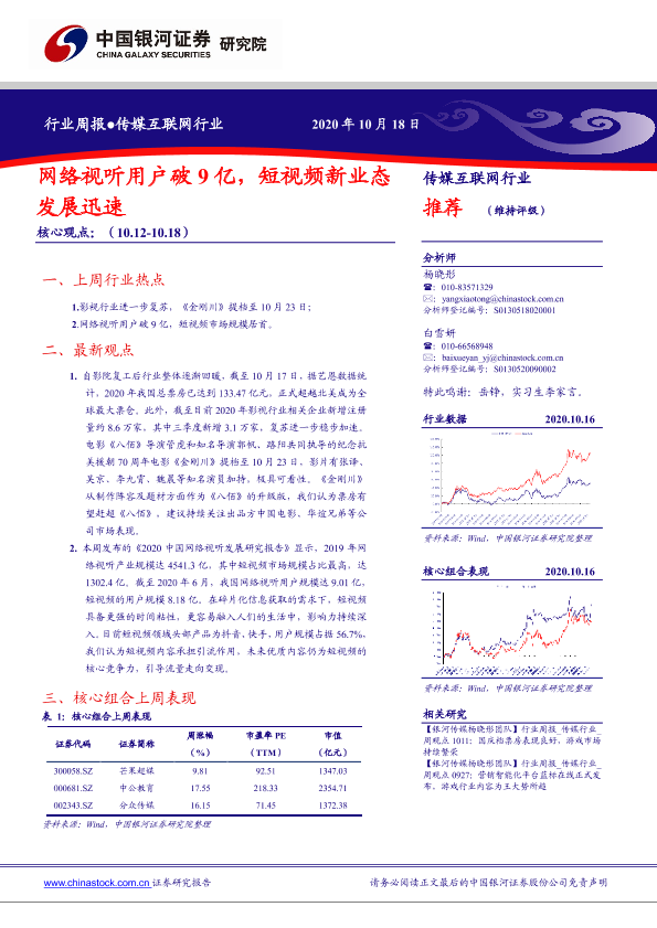 【银河证券】【20201018】20201018-中国银河-传媒互联网行业周报:网络视听用户破9亿,短视频新业态发展迅速-32页