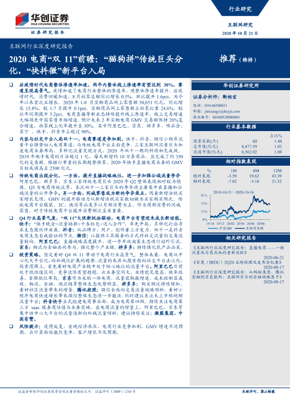 【华创证券】【20201021】2020电商“双11”前瞻:“猫狗拼”传统巨头分化,“快抖微”新平台入局-18页