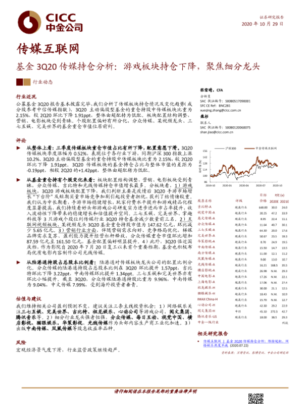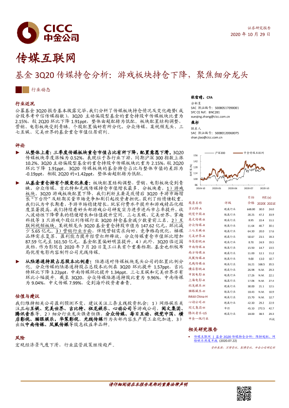 【中金公司】【20201029】基金3Q20传媒持仓分析:游戏板块持仓下降,聚焦细分龙头-10页