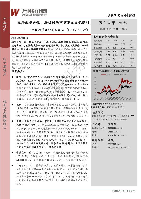 【万联证券】【20201025】互联网传媒行业周观点:板块表现分化,游戏板块回调不改成长逻辑-14页