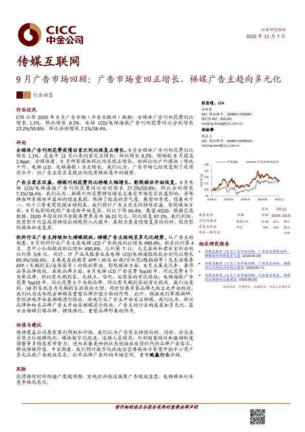 【中金公司】【20201107】9月广告市场回顾:广告市场重回正增长,梯媒广告主趋向多元化-7页