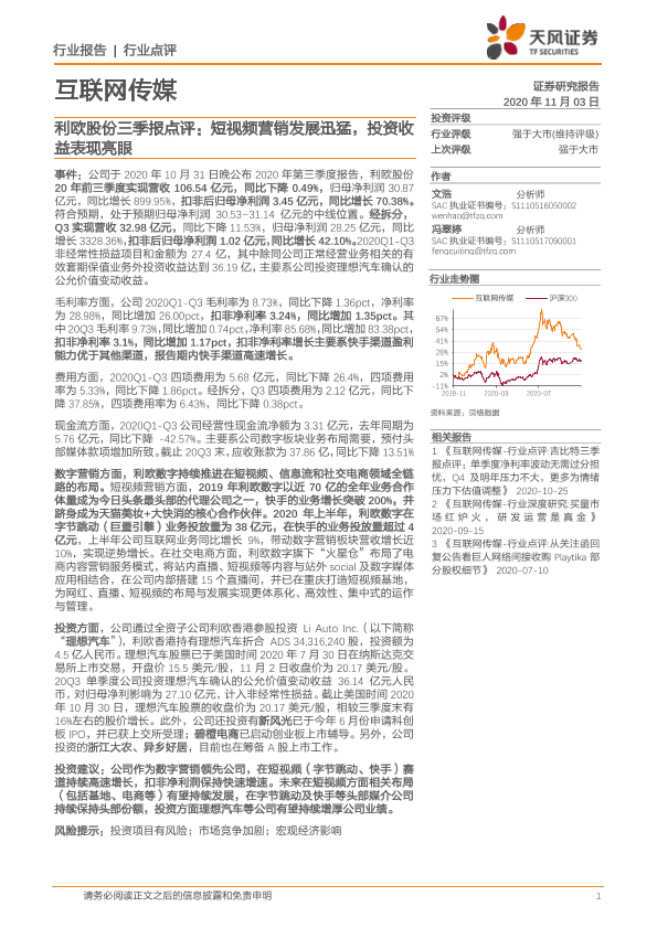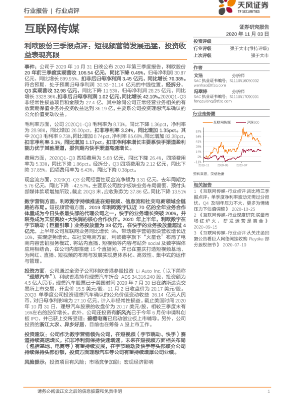 【天风证券】【20201103】互联网传媒:利欧股份三季报点评:短视频营销发展迅猛,投资收益表现亮眼-9页