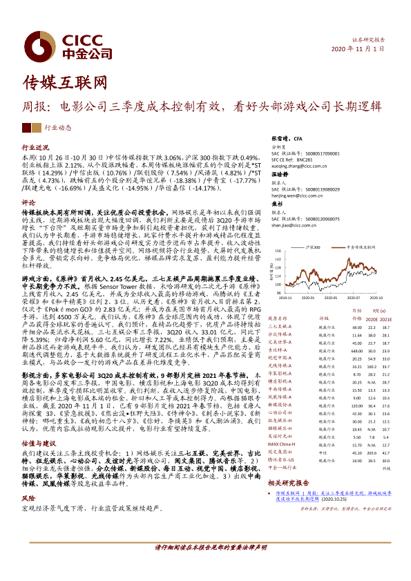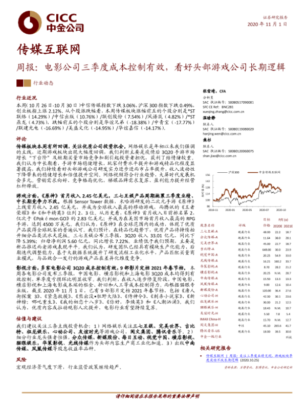 【中金公司】【20201101】传媒互联网周报:电影公司三季度成本控制有效,看好头部游戏公司长期逻辑-20页