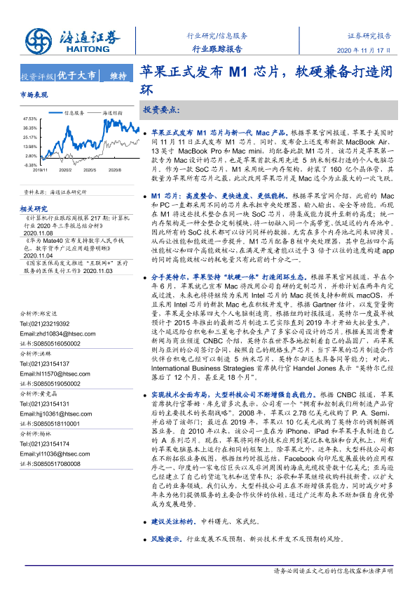【海通证券】【20201117】信息服务行业跟踪报告:苹果正式发布M1芯片,软硬兼备打造闭环-2页