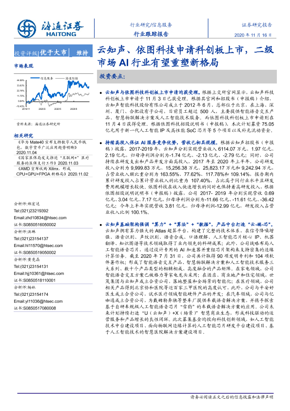 【海通证券】【20201116】信息服务行业跟踪报告:云知声、依图科技申请科创板上市,二级市场AI行业有望重塑新格局-3页