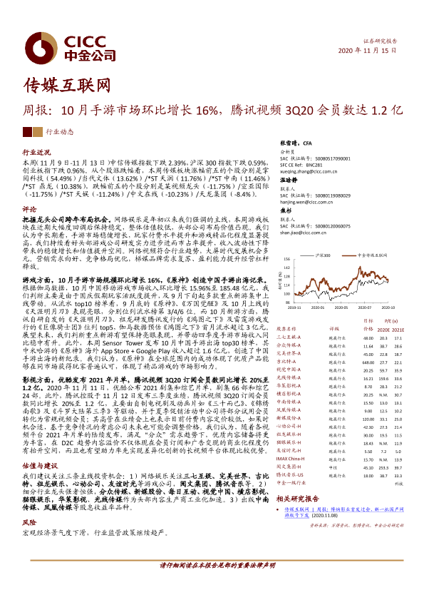 【中金公司】【20201115】传媒互联网周报:10月手游市场环比增长16%,腾讯视频3Q20会员数达1.2亿-19页