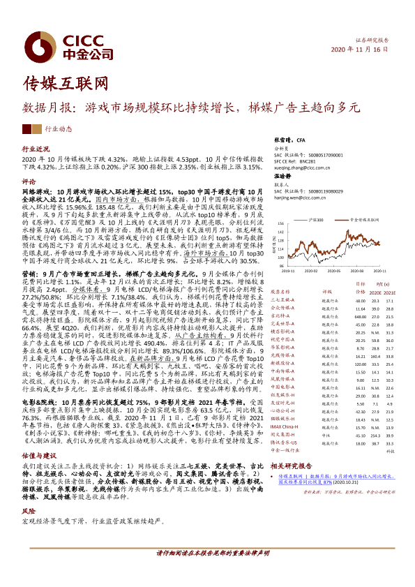 【中金公司】【20201116】传媒互联网数据月报:游戏市场规模环比持续增长,梯媒广告主趋向多元-19页
