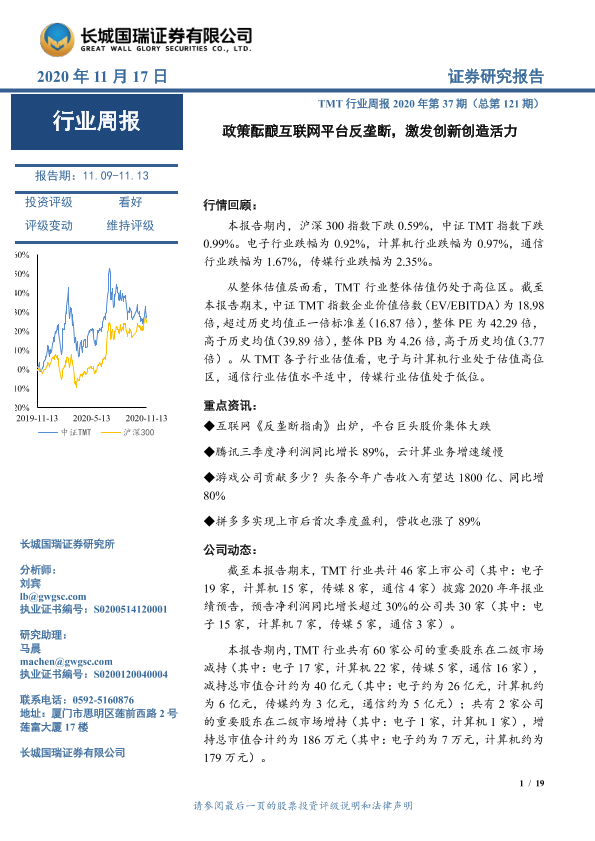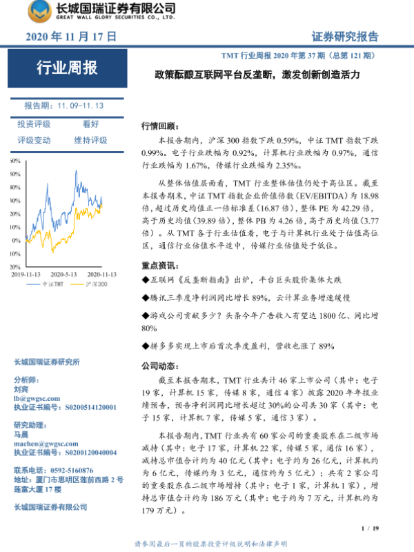 【长城国瑞证券】【20201117】TMT行业周报2020年第37期(总第121期):政策酝酿互联网平台反垄断,激发创新创造活力-19页