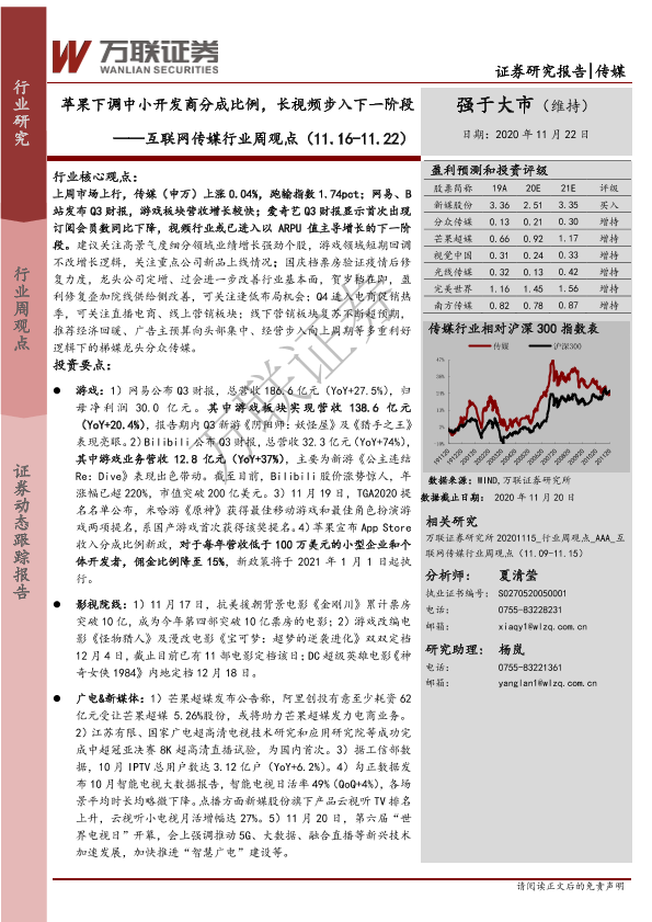 【万联证券】【20201122】20201122-万联证券-互联网传媒行业周观点:苹果下调中小开发商分成比例,长视频步入下一阶段-14页