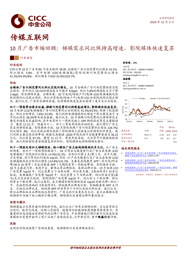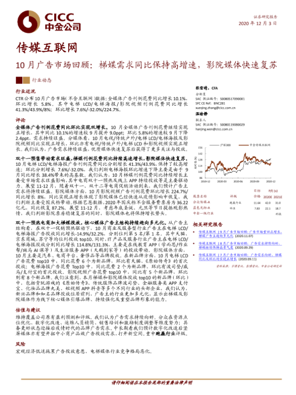 【中金公司】【20201203】20201203-中金公司-传媒互联网10月广告市场回顾:梯媒需求同比保持高增速,影院媒体快速复苏-7页