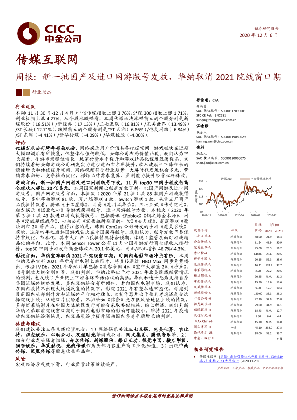 【中金公司】【20201206】传媒互联网周报:新一批国产及进口网游版号发放,华纳取消2021院线窗口期-19页