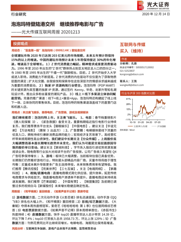 【光大证券】【20201214】20201214-光大证券-传媒互联网周报:泡泡玛特登陆港交所 继续推荐电影与广告-12页