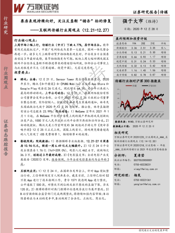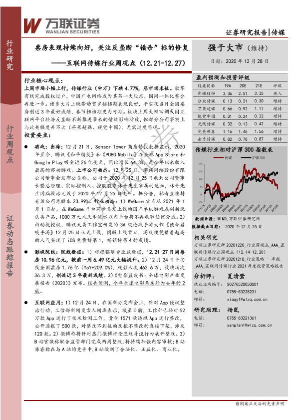 【万联证券】【20201228】20201228-万联证券-互联网传媒行业周观点:票房表现持续向好,关注反垄断“错杀”标的修复-14页