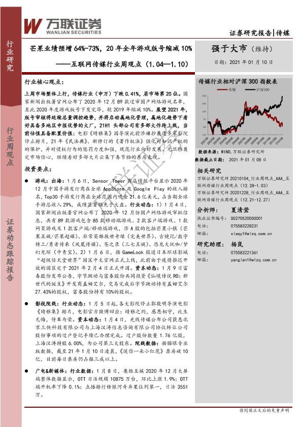 【万联证券】【20210110】互联网传媒行业周观点:芒果业绩预增64%-73%,20年全年游戏版号缩减10%-13页