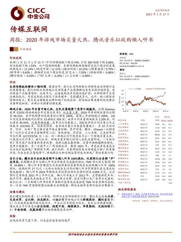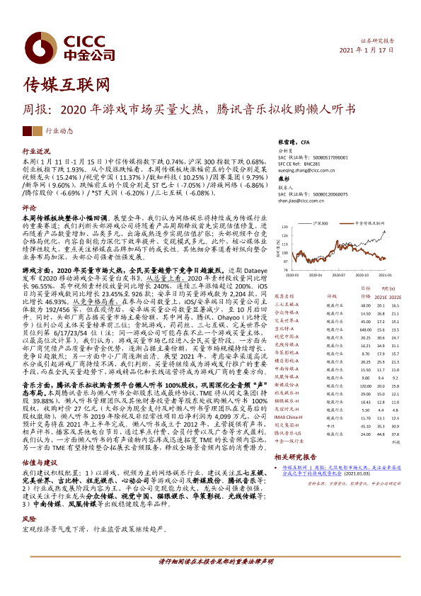 【中金公司】【20210117】20210117-中金公司-传媒互联网周报:2020年游戏市场买量火热,腾讯音乐拟收购懒人听书-19页