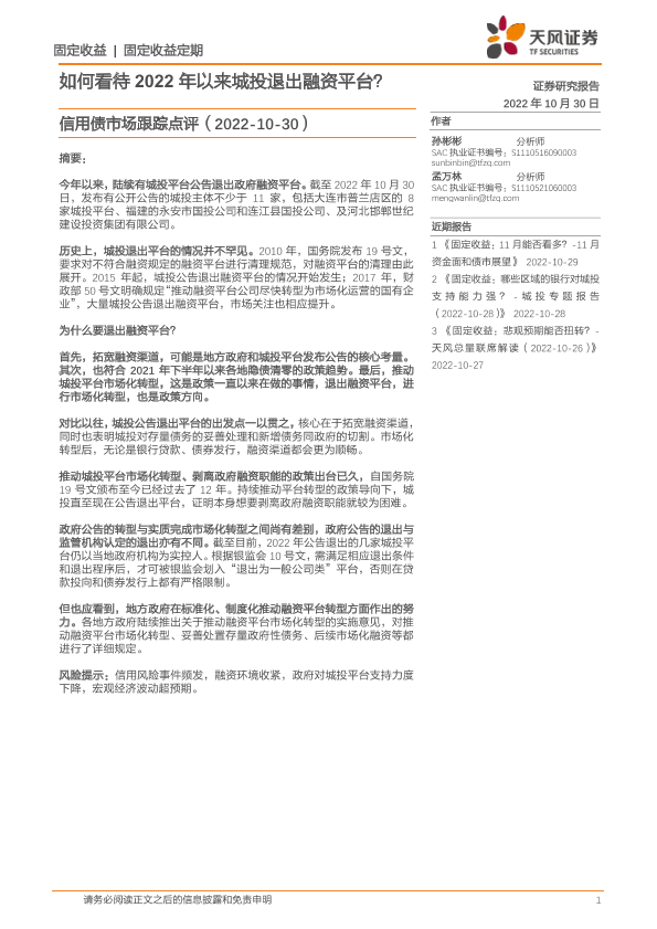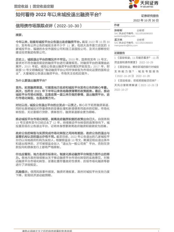 【天风证券】【20221030】信用债市场跟踪点评:如何看待2022年以来城投退出融资平台?-24页