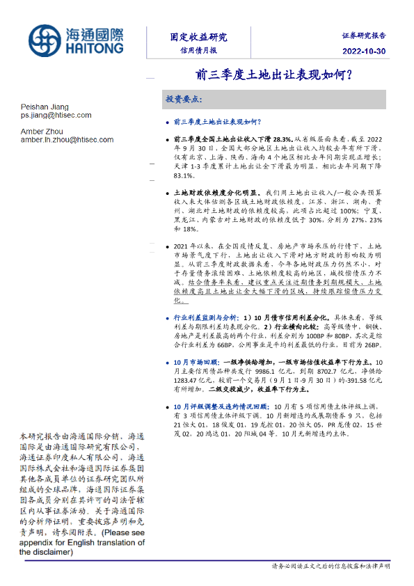 【海通国际】【20221030】信用债月报:前三季度土地出让表现如何?-23页
