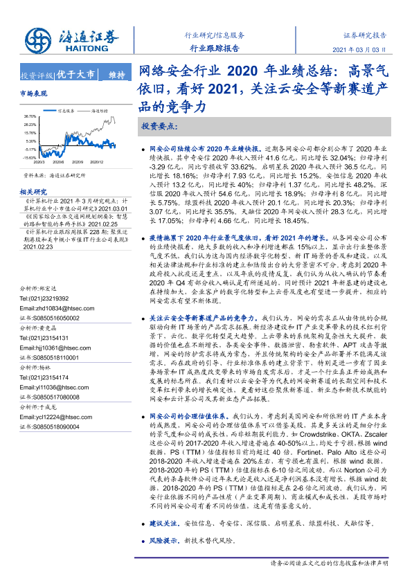 【海通证券】【20210303】网络安全行业2020年业绩总结:高景气依旧,看好2021,关注云安全等新赛道产品的竞争力-2页